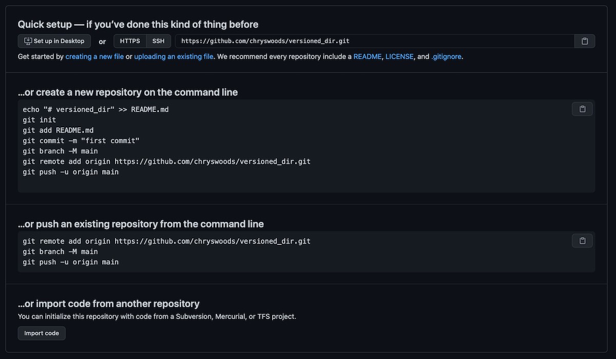 Choose a name for your repository. I’ve used versioned_dir, as this is what I called the directory on my computer. You can use any name you want, and it does not need to match the name on your computer.